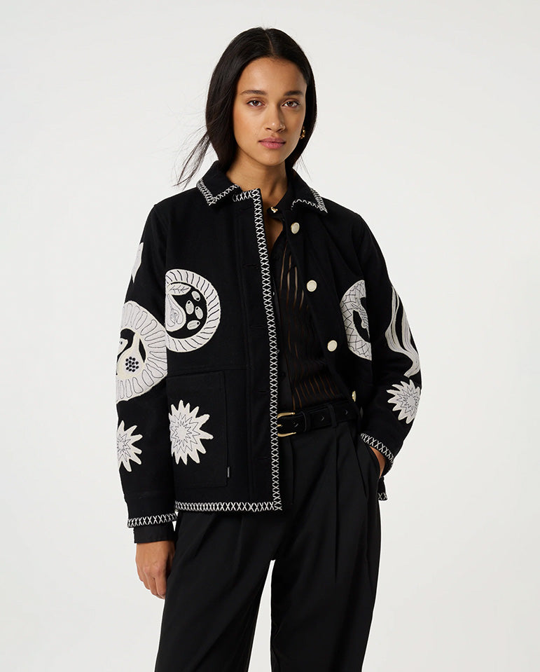 The Elias Jacket is a modern outer layer that balances sharp tailoring with everyday wearability in it's black and white design.