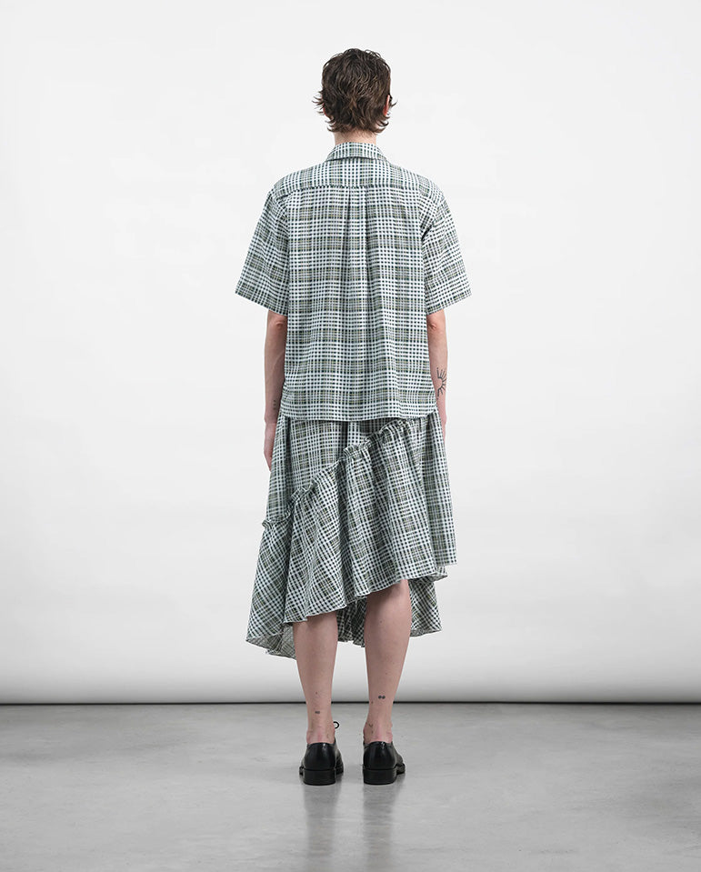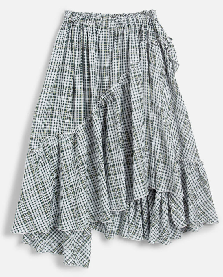 Draped mid-length skirt in a classic multi-tone check design. This YMC statement piece features asymmetric frills, an elasticated waistband, an internal cotton tie and baby lock edges. Pairs perfectly with the Eva Shirt.
