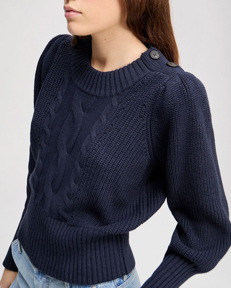 Munthe cable knit sweater with elegant, wide sleeves and a fine, high ribbed edge at both the cuffs and the hem. This jumper is finished with a tonal button closure at the neckline.