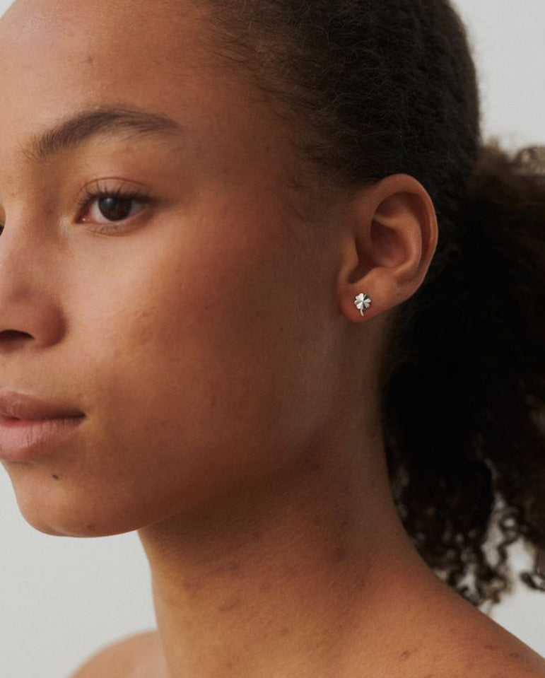 Pair of small clover earring studs from Pernille Corydon. The set includes one moon (5 mm) and one star (6 mm), both with a naturally brushed surface.