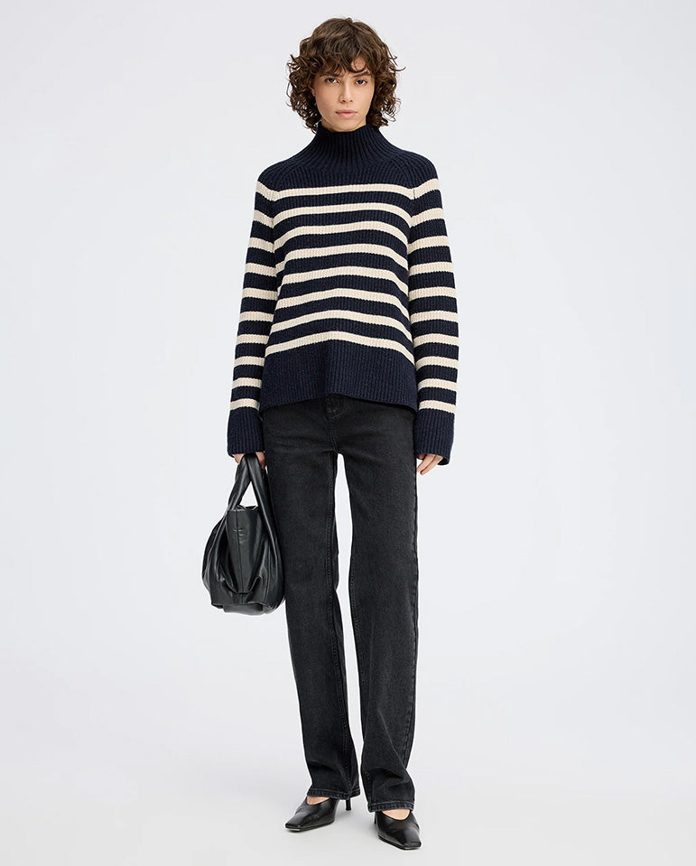 Classic striped and structured knit, made with a blend of soft cotton and wool. The knit has long sleeves and an elegant t-neck style.