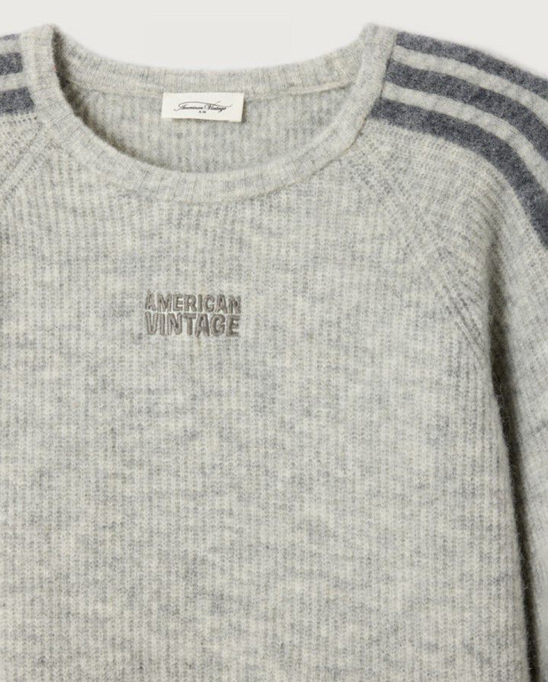 Crew neck sweater with American Vintage spell out logo on the front, crew neckline, and stripe design on 3/4 sleeves.
