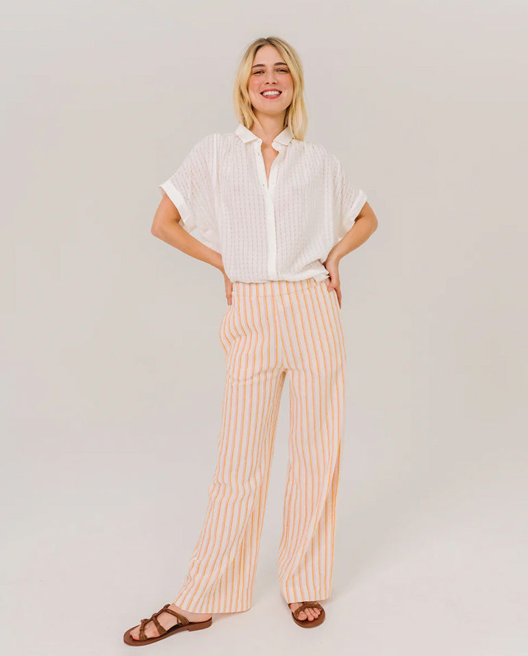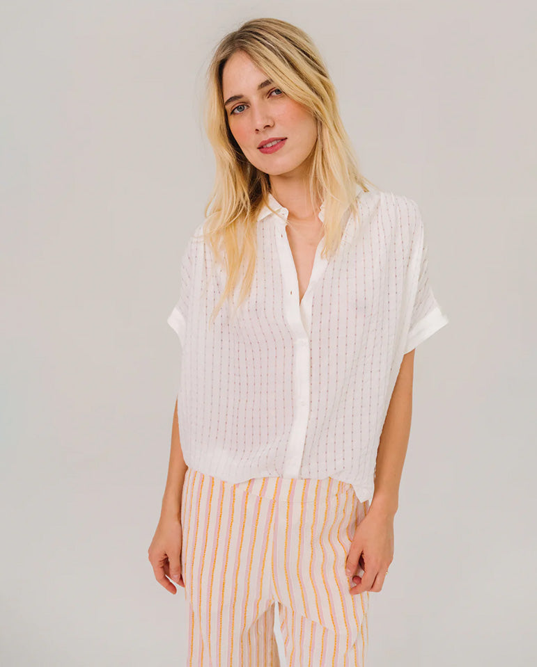 Short-sleeved top with textured, sheer detailing. Finished with gathering at the shoulders and back, dropped shoulders, turn-up cuffs, a classic shirt collar, and exposed buttons.
