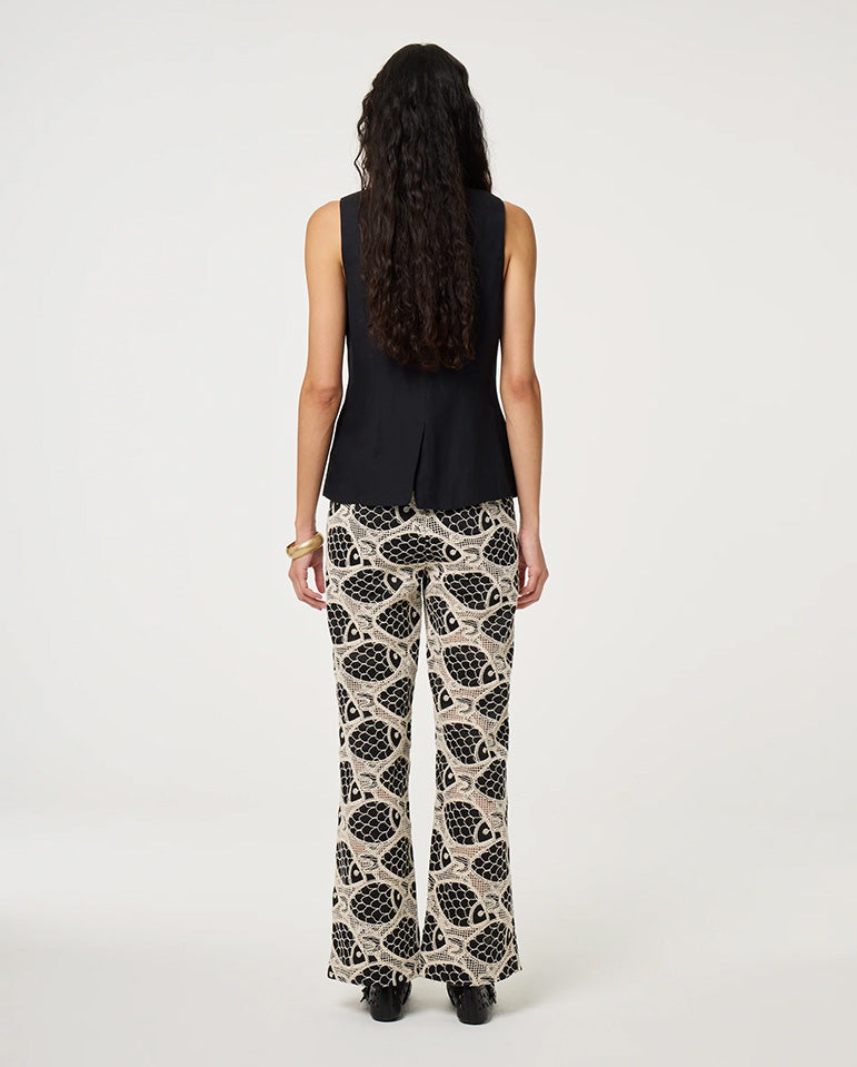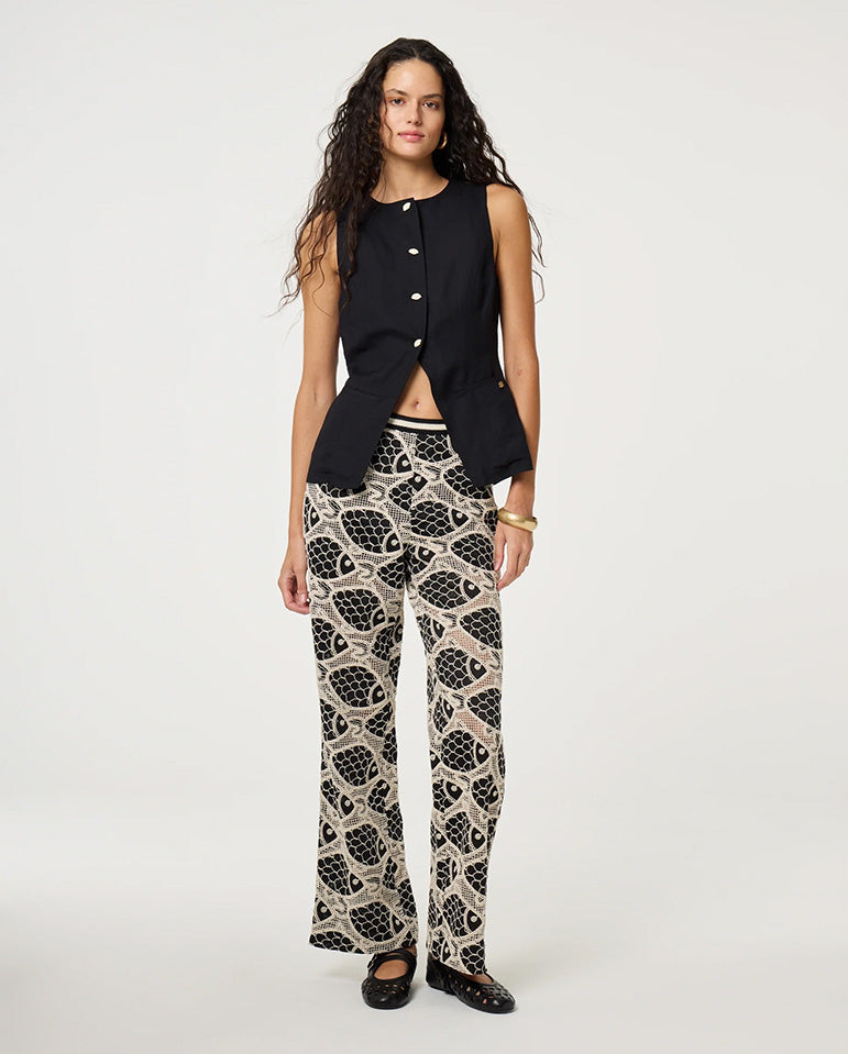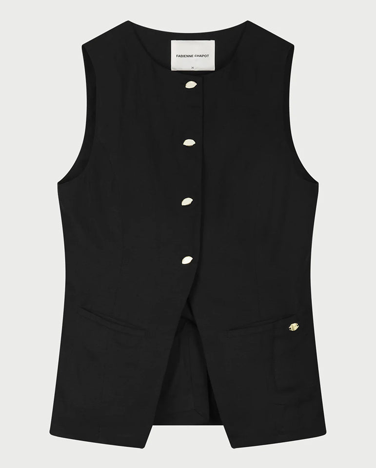 Sleeveless tailored vest with a clean crew neckline and a sophisticated button-down front, designed with a subtle flare at the hem. The fabric is lightweight and structured, offering a polished finish that works for both professional and social settings.