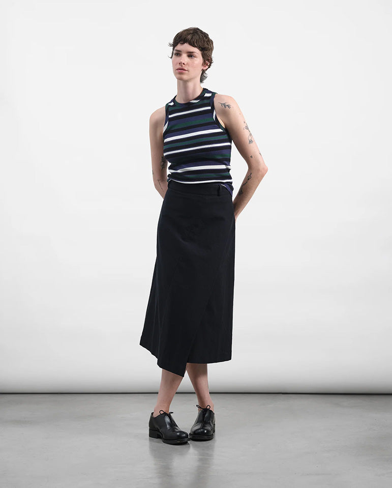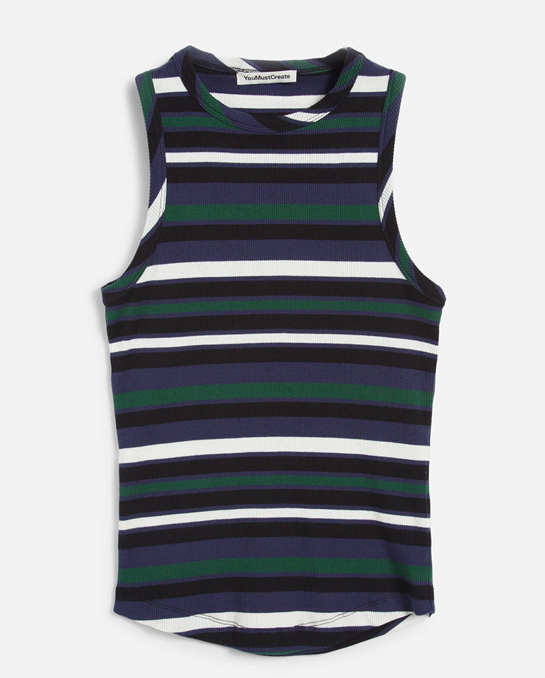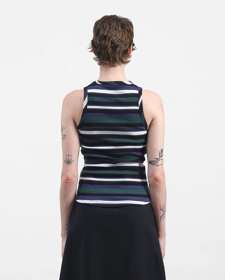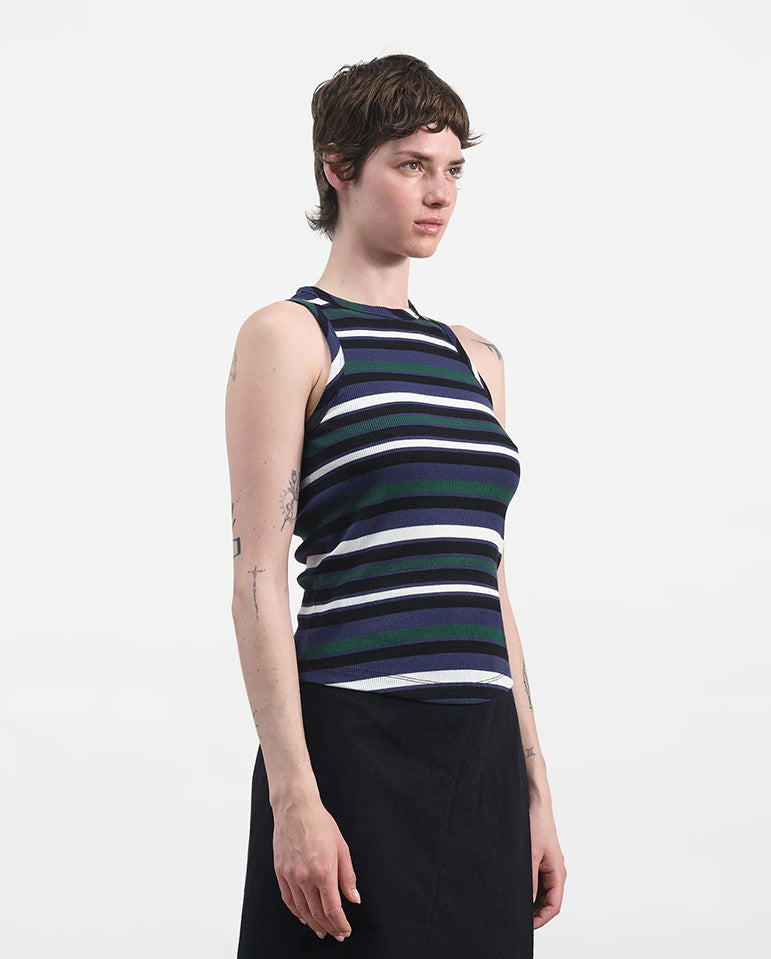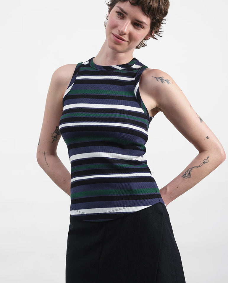 Fitted vest top cut from Portuguese organic cotton jersey for a ribbed, multi tone stripe finish. Features a racer neck, self fabric binding on neck and arms, a baseball style top stitching and curved hem.