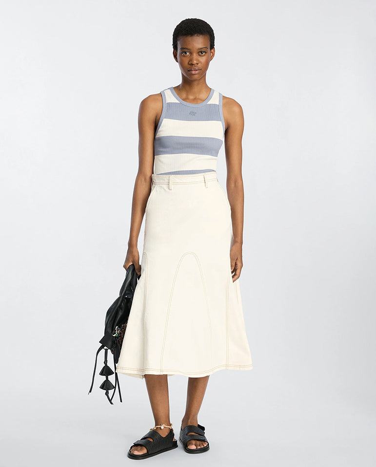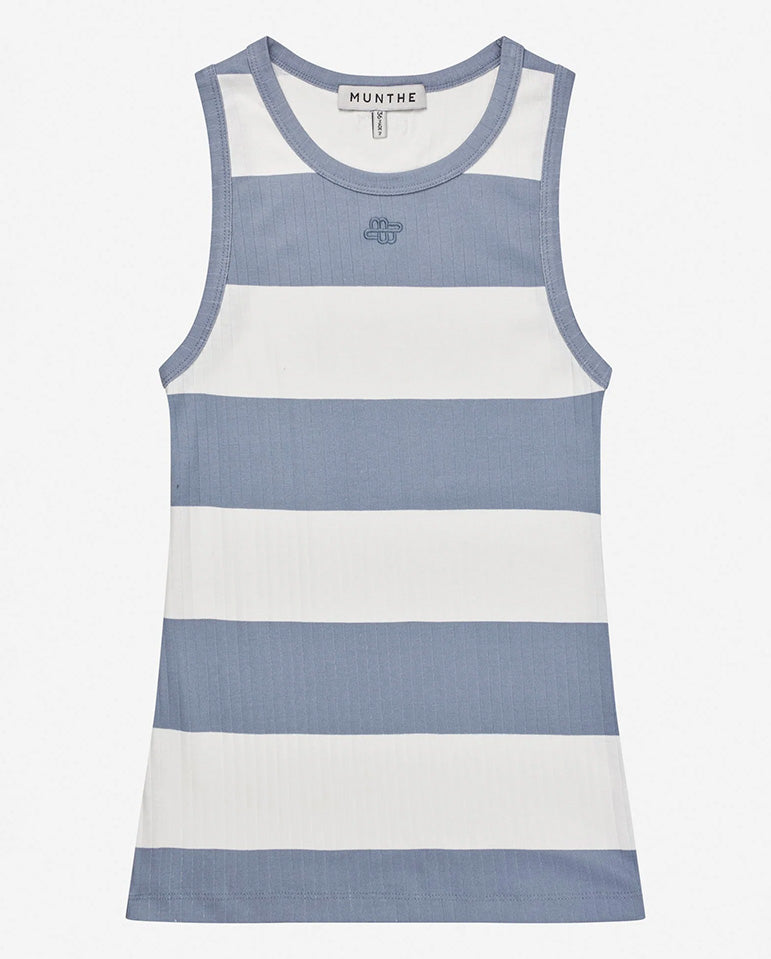 Sleeveless ribbed tank with centre emblem embroidery and block style white and blue stripes. Designed for a close fit with a round neckline, finished with MUNTHE logo on the back neck.