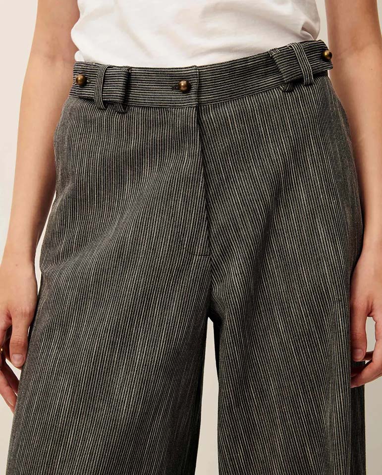 Loose-fitting, high-rise trousers in textured cotton coutil featuring thin slub-yarn stripes. Designed to sit high on the waist, with a jewelled button closure and concealed zip.