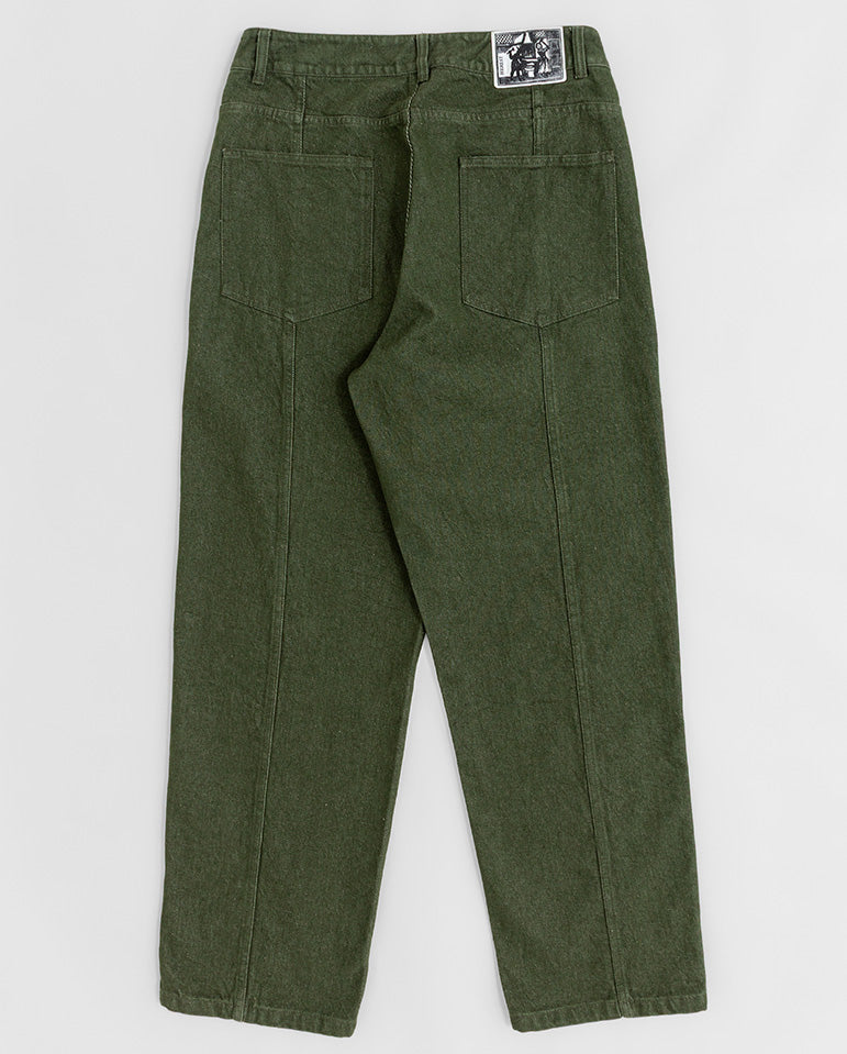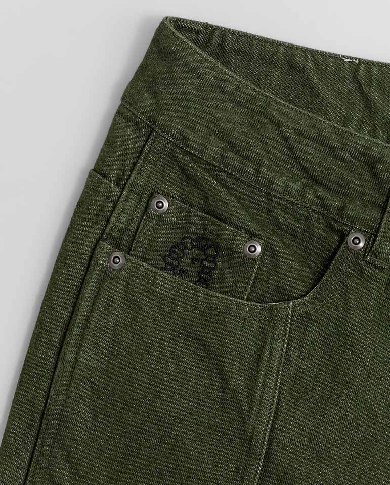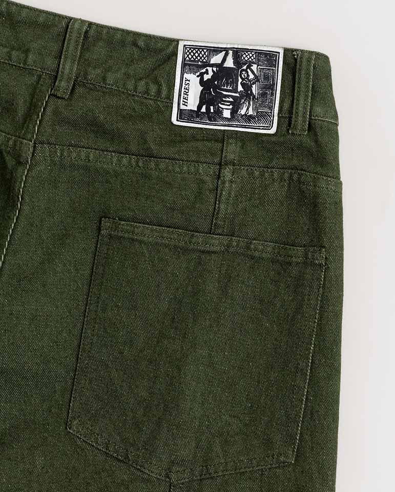 Not your average denim... Heresy 5 pocket jeans in green one wash denim, designed for a relaxed fit. Features a 4 panel leg seam, YKK zip fly and rivets and an Arch logo embroidered on coin pocket.  Made from 100%...