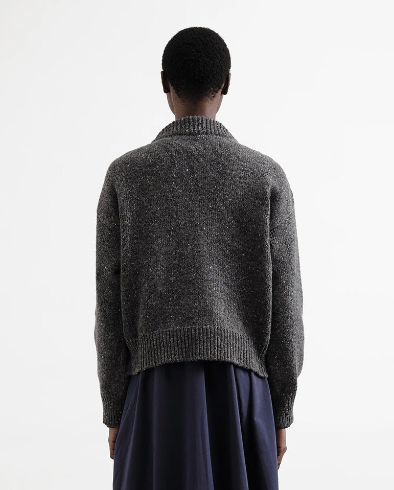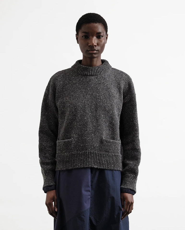 Let YMC's quality virgin wool keep you warm for many winters to come... Boxy knitted jumper designed for a relaxed, cropped fit, cut from a Donegal wool blend. Finished with a chunky ribbed high neck, slit style pockets and rib...