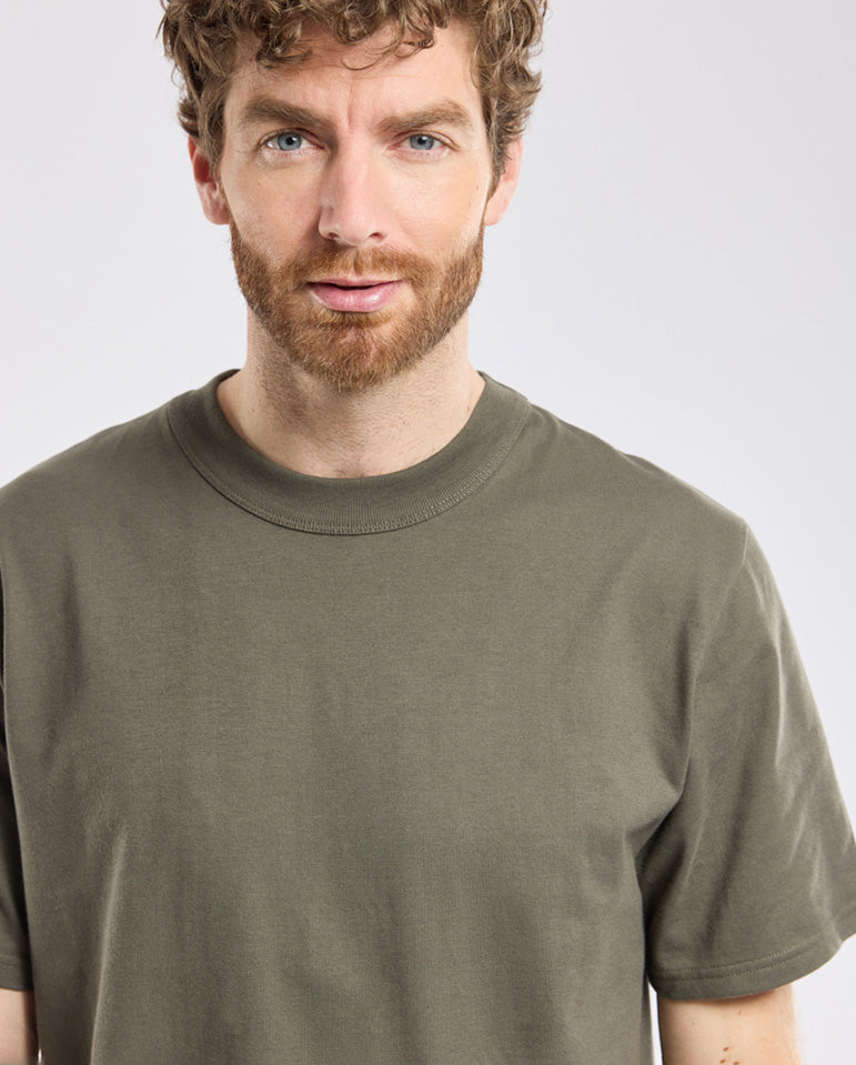 Short-sleeved t-shirt in a thick cotton with a slightly slim-fit, featuring a thick collared round neck and a mini Armor Lux logo tag embroidered on the lower left side.