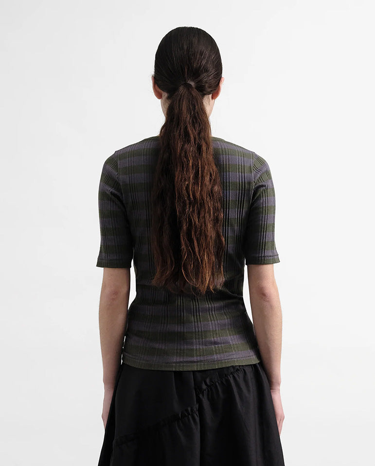 Try a little more length on your T shirt sleeve, you might just love it... Crew neck ribbed t-shirt, yarn dyed in two-tone stripe, designed for a slim fit. Features baseball style top stitching, and self fabric binding on neck. ...