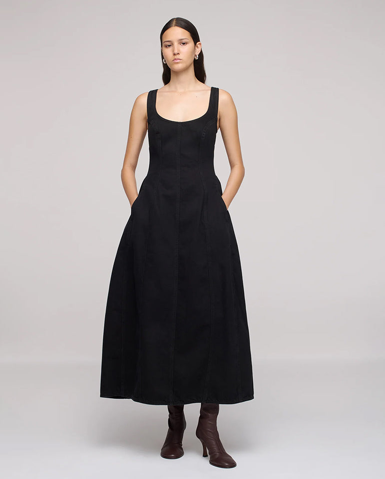 Cocoon yourself in DALA Denim... Scoop neck dress designed for a fitted bust and waist, with an exaggerated, cocooned shaped skirt. It features signature DALA seam detailing, with godet panels at the hips and is finished with a CB zip....