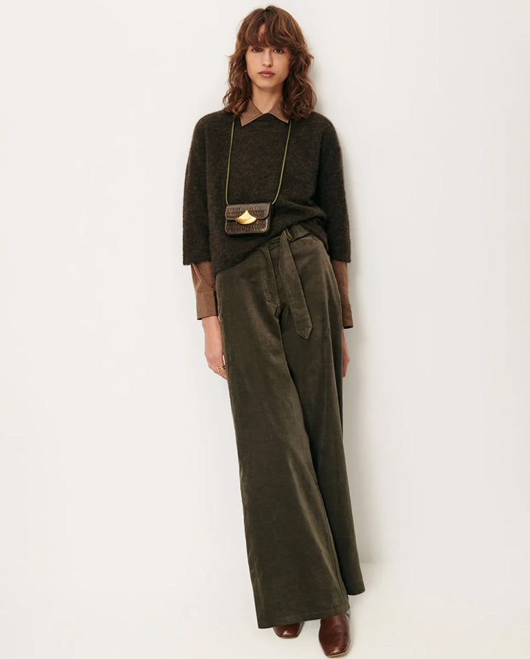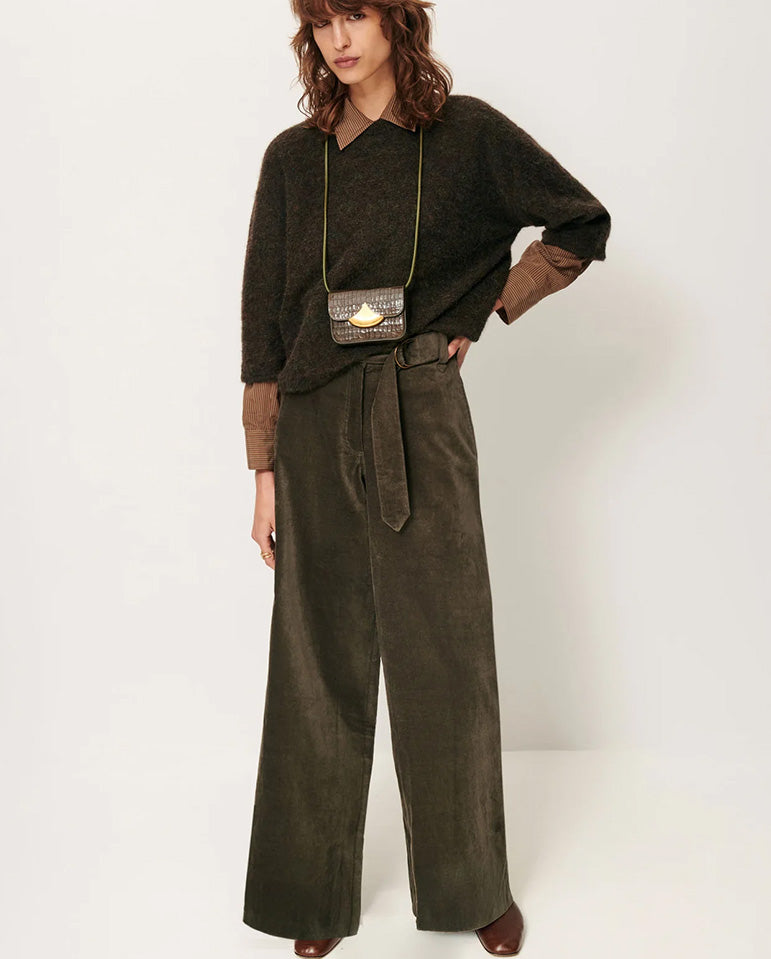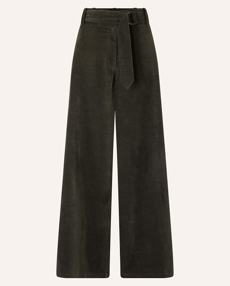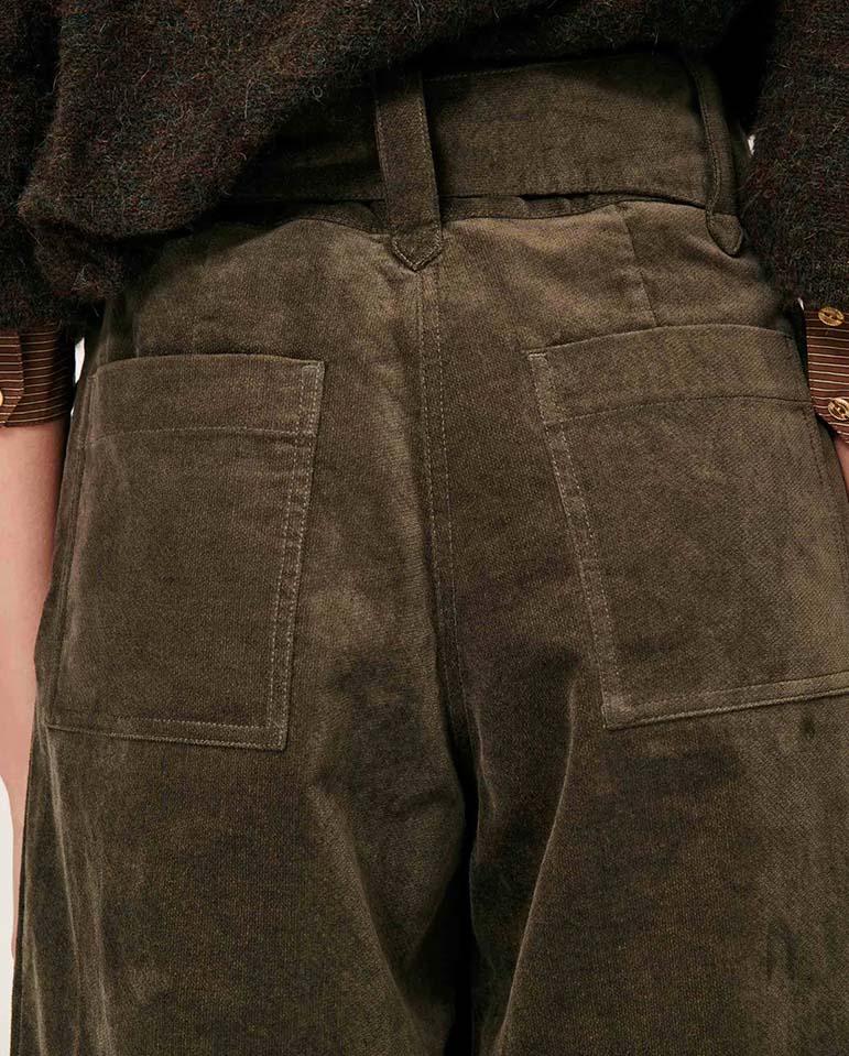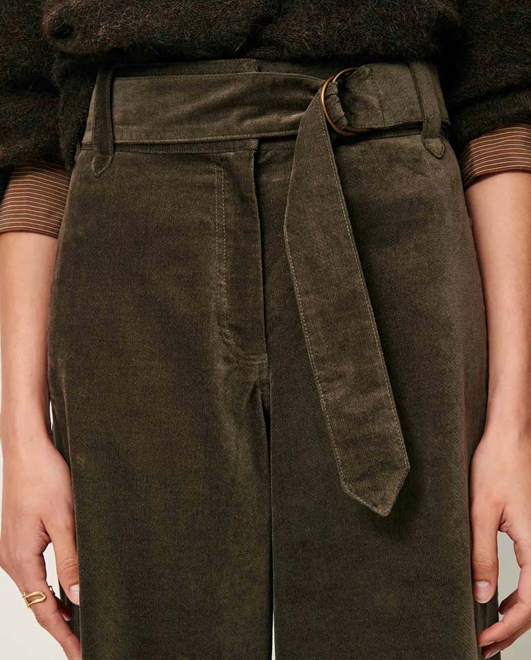 Wide and high... Wide-leg trousers in short-pile velvet basket-weave fabric with a moiré effect. Finished with a detachable belt made from the same fabric with a military-inspired buckle, welt pockets on the side and patch pockets at the back. Made...