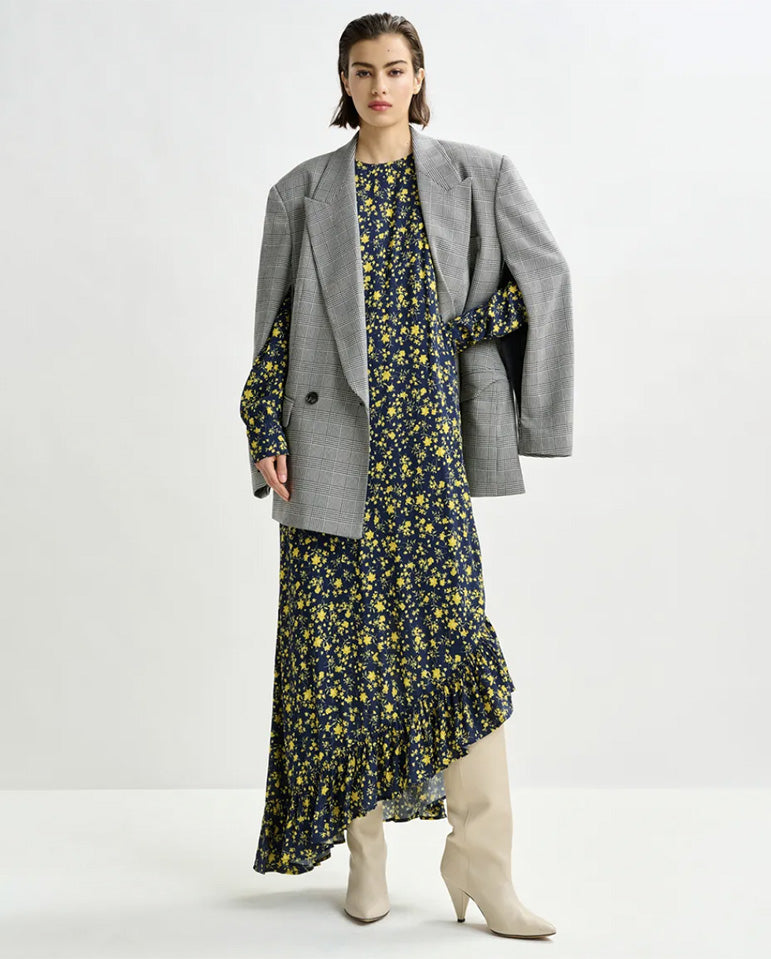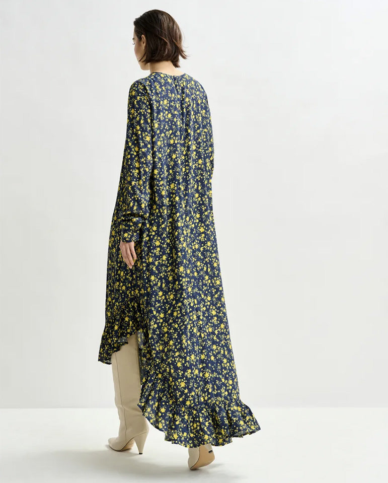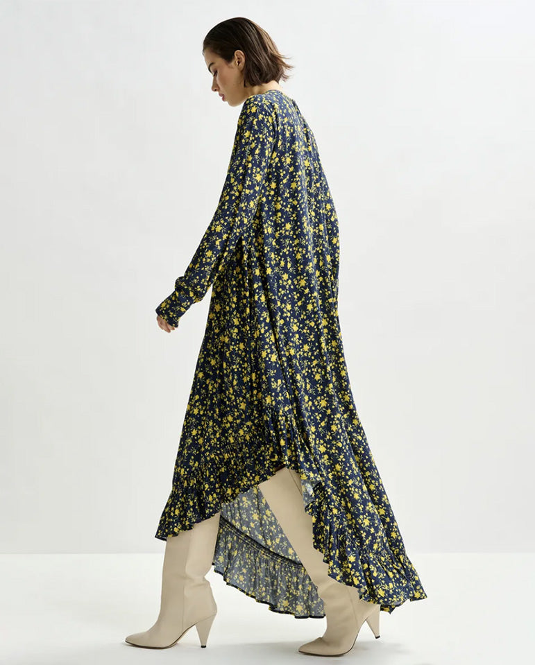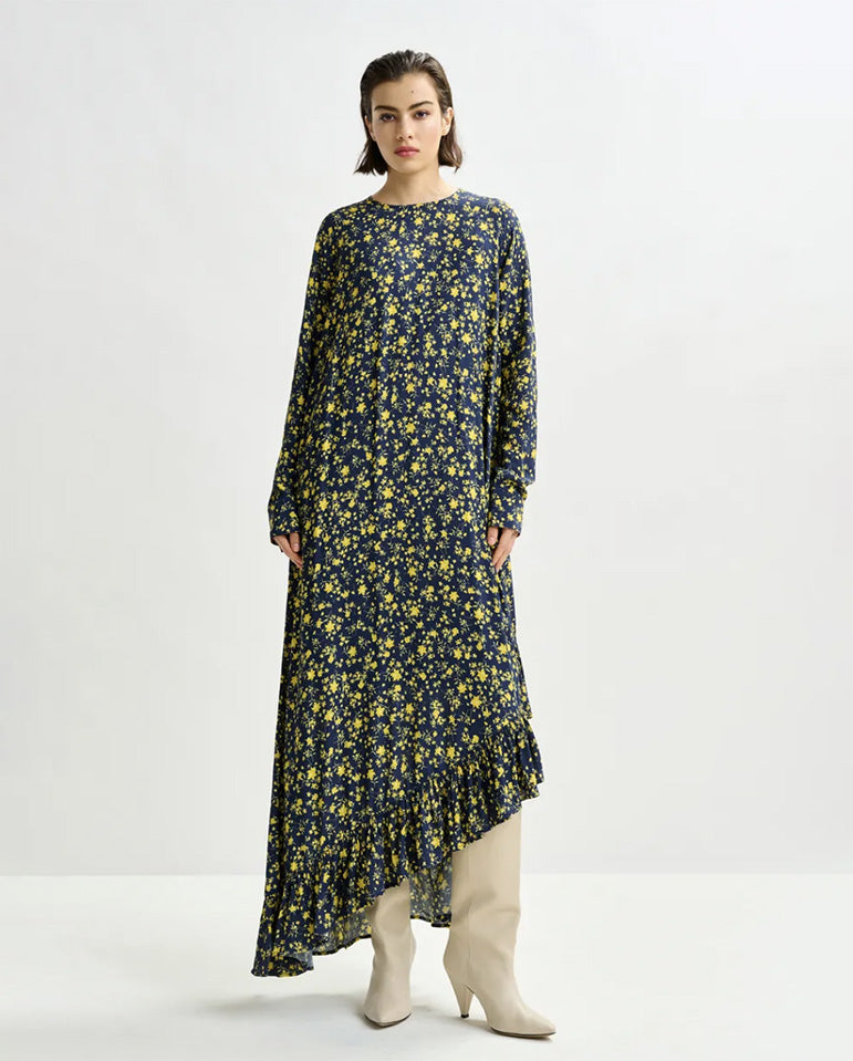 Complete with a separate slip for coverage, this piece transitions effortlessly from day to evening... Crafted from lightweight crepe, the Igraine Dress features an asymmetrical hemline trimmed with soft ruffles. The self-fabric belt cinches the waist, while a hidden zip fastening...