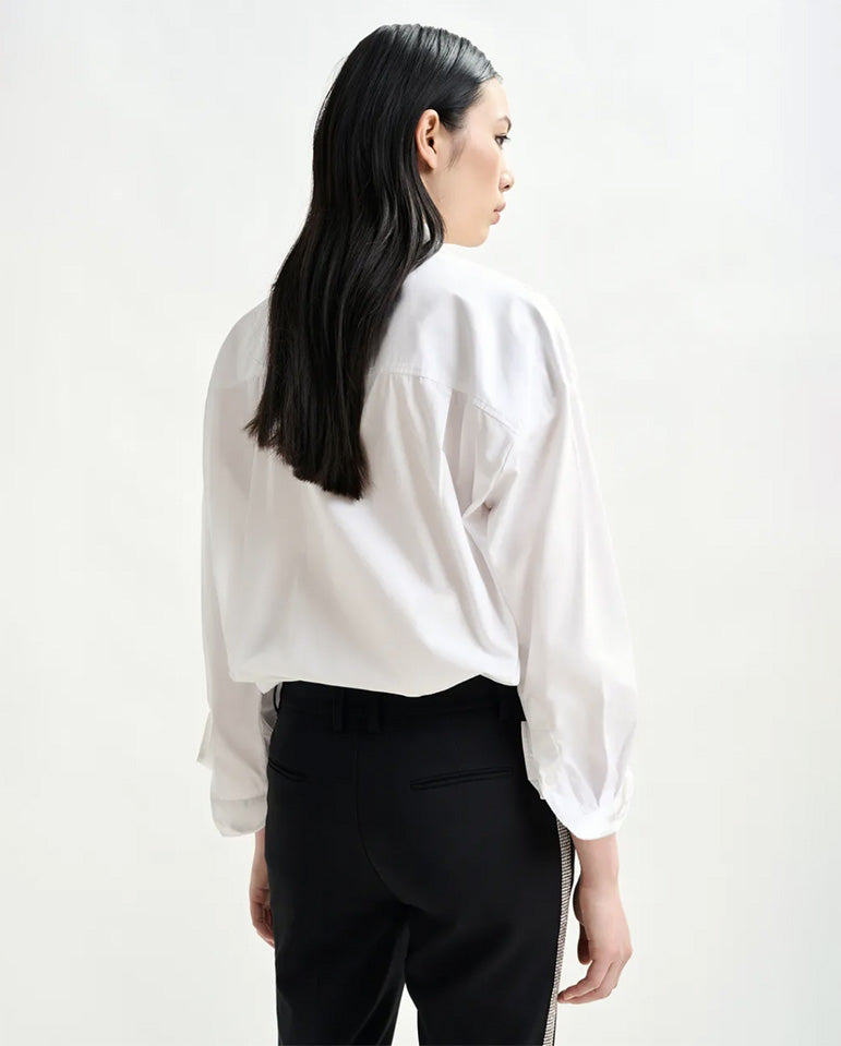 Oversized shirt with dropped shoulders and a curved hem that falls longer at the back. It features a full button fastening, classic pointed collar and a sweeping feather motif embroidered with sequins, rhinestones and beads.