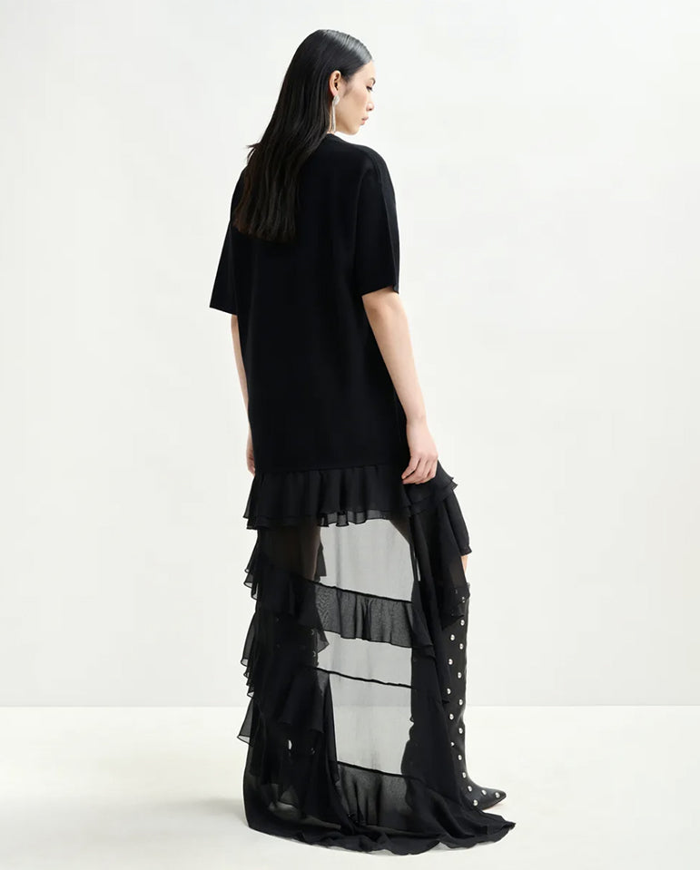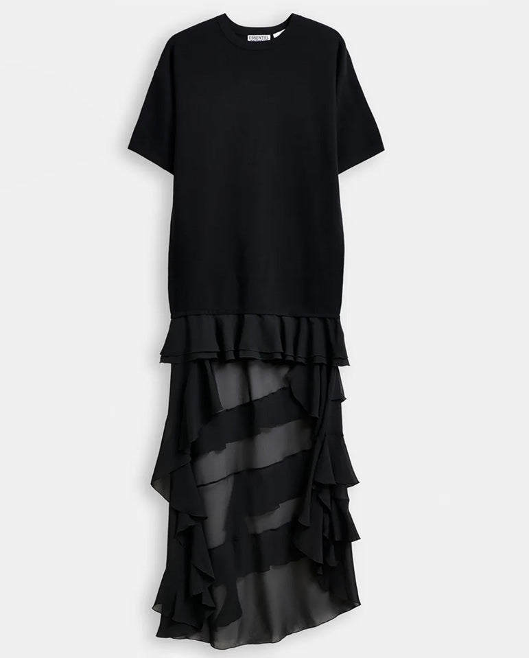 The contrast of textures adds depth and movement to this minimalist shape... This Essentiel Antwerp dress is shaped to a relaxed T-shirt silhouette with a round neckline and short sleeves. It falls into a straight fit through the body before...