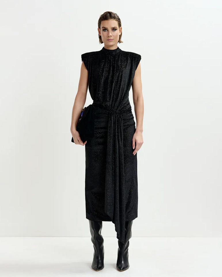 Embrace party season with an Essentiel Antwerp frock... Essentiel Antwerp midi dress embellished with black-tone dots for a glitter-like finish. Features a wrap-inspired skirt with box pleat gatherings at the front and a generous split, finished with lightly padded shoulders...