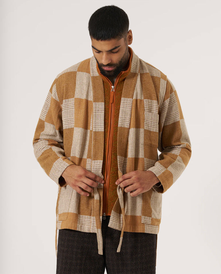 Sometimes it's the most simple layers that have the biggest impact... A superb sand check fabric cut into a loose-fitting jacket, unstructured, with ties to fasten. The Kyoto Work Jacket makes for a great throw-on layer. Also available in Black...