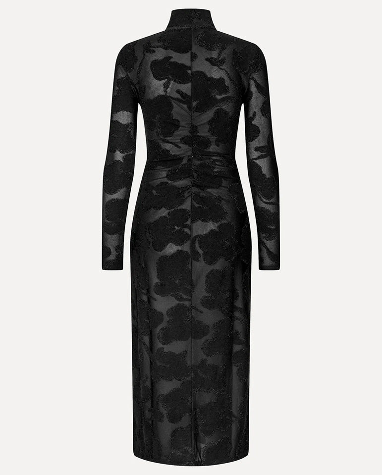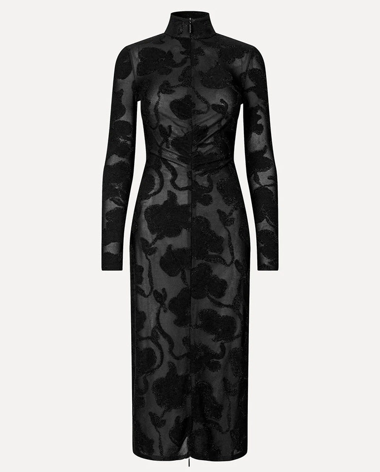 Give black cat a new meaning in this season's Stine Goya... Semi-sheer black midi dress with an all over metallic floral pattern. Features a high turtleneck with 1/4 zip, long sleeves, and a front slit with adjustable zipper. Made from...