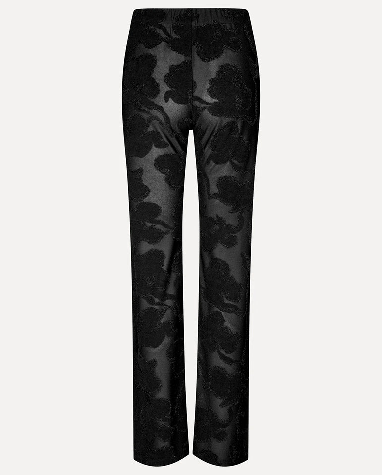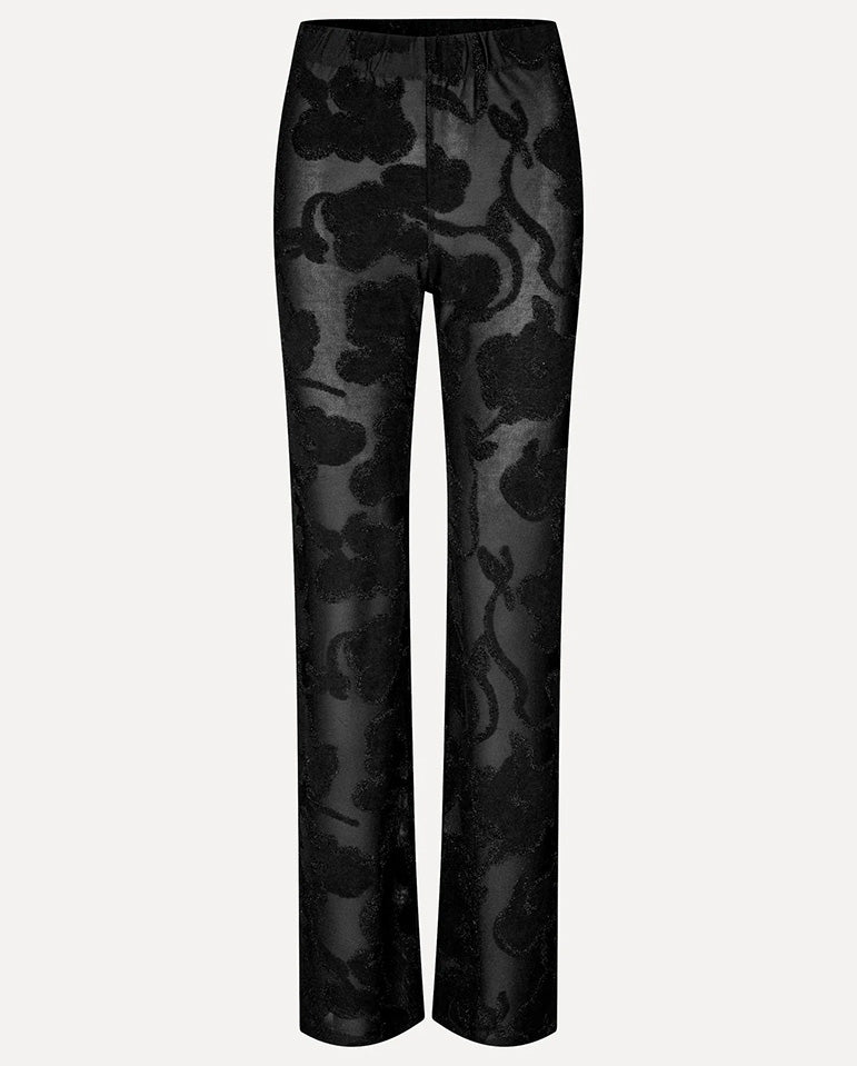 Flattering straight-leg pants cut from soft black jersey with a black metallic floral pattern. Designed with a high elasticated waist, these trousers are semi-sheer.