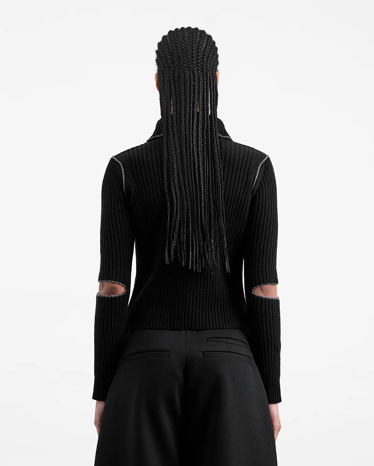 Slim fit, cropped knitted jumper with contrast yarn detailing and elbow cut outs. Made from virgin wool, the Peeka Knit has a ribbed finish, spread collar and side splits on the hem.