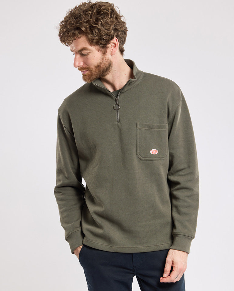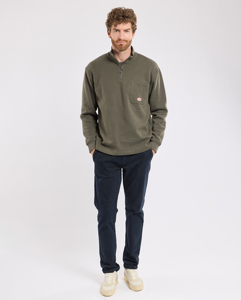 A handy quarter zip from French heritage brand Armor Lux... Quarter zip sweatshirt with a high neck and front patch pocket. Finished with a ribbed hem and cuffs in this seasons Chimera khaki green. Made from 100% cotton. See label...