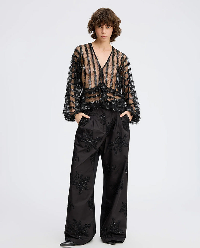 Party season is well underway, and fear not, Munthe has you covered... The Remona is a sheer sequin blouse with long, slightly puffed sleeves and a feminine V-neckline. At the waist, there is a tie belt that can be fastened...