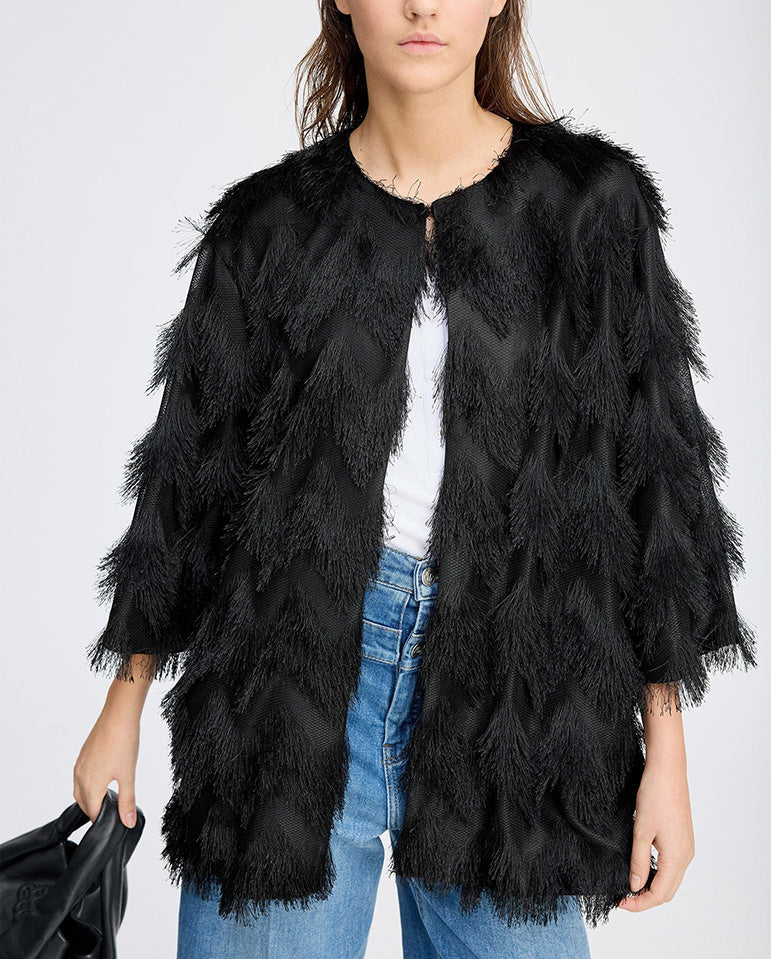 The styling possibilities are endless... Black statement jacket with a fringed texture in a subtle zigzag pattern, designed with a round neckline and 3/4-length sleeves. The jacket fastens with a hook at the top of the neck, leaving endless styling...