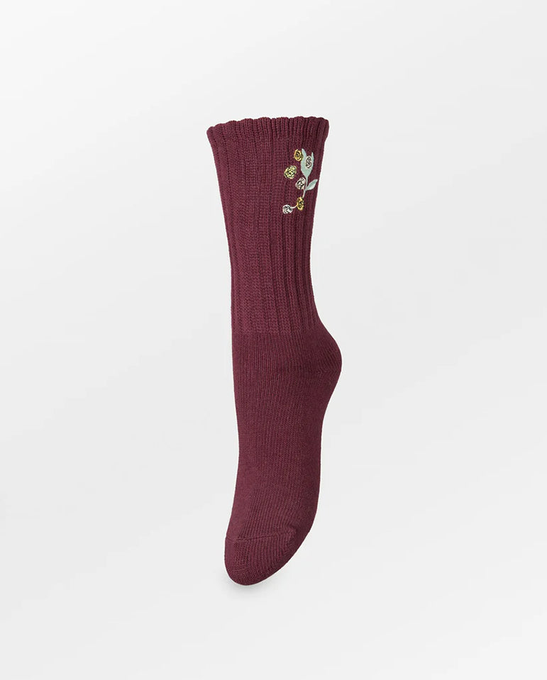 Rich red hues for AW provide a cosy pop of colour to strengthen your sock game, the Rosy Cotta Sock is finished with ribbing on the ankle and floral embroidery.